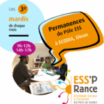 - Permanences ESS’PRance à Ecodia DinanNouvelles permanences gratuites à Ecodia Dinan !« Appui-conseil aux associations et porteur·ses de projet »Tous les 3e mardis du mois, 9h-12h & 14h-17h, Dinan ► DATES DES PERMANENCE :Tous les 3e mardis du moisDe 9h à 12h et 14h à 17h ► LIEU :Ecodia33 av René Cassin, 22100 Dinan ► ORGANISÉ PAR :ESS’PRance et Ecodia ► TARIF :Gratuit… Lire la suite : Permanences ESS’PRance à Ecodia Dinan
