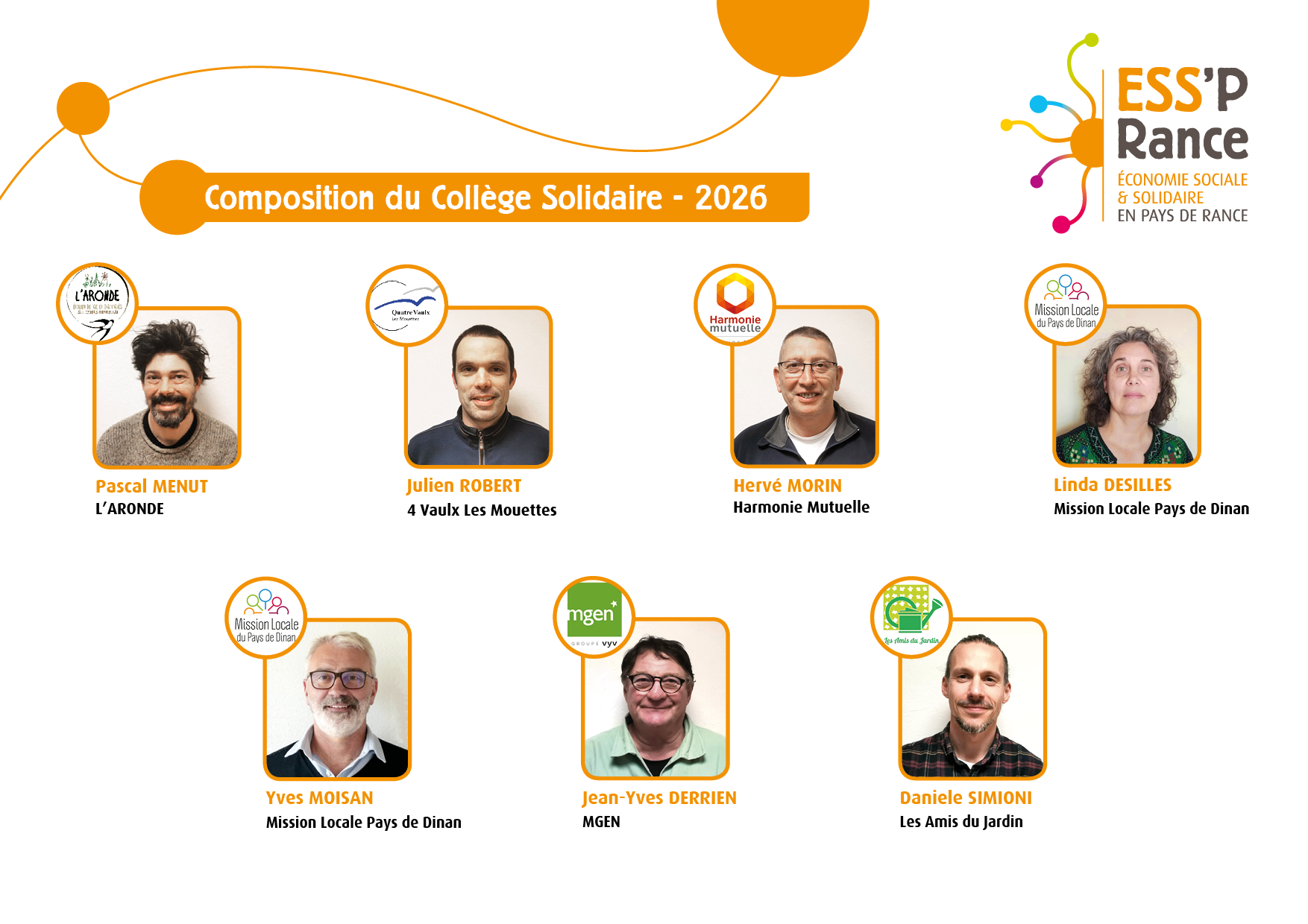 En 2026, ESS’PRance a révisé ses statuts, et aujourd’hui c’est un Collège Solidaire (anciennement « Bureau« ) qui est chargé d’impulser la stratégie de l’association. Notre Collège Solidaire est  composé de 7 membres [6 structures ESS du territoire].